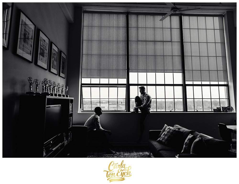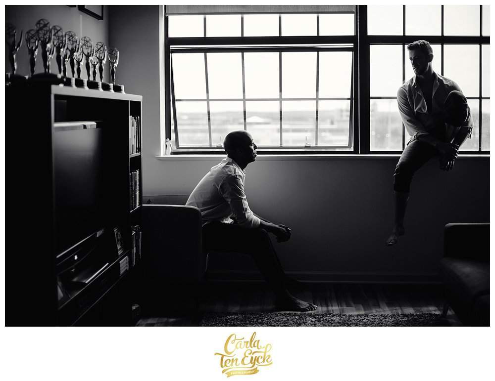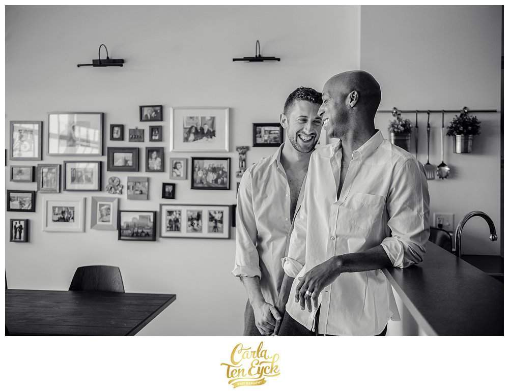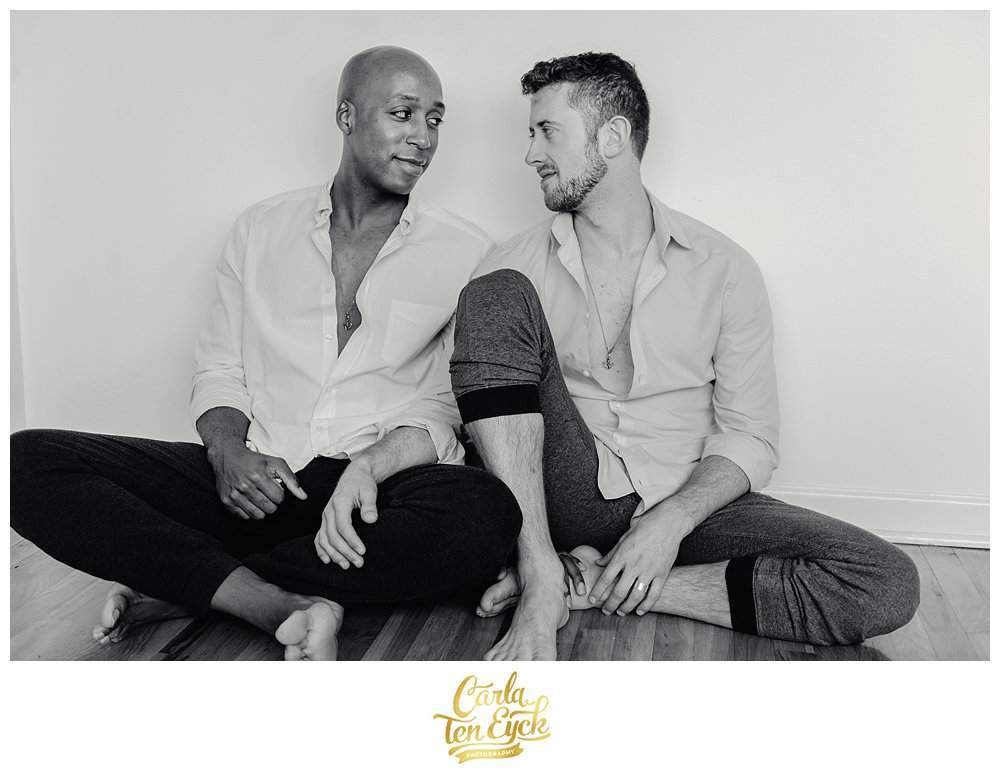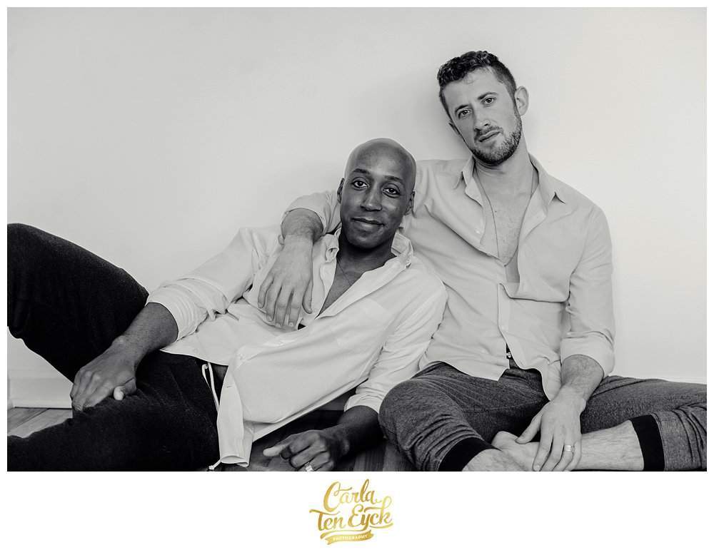 There is something really romantic about a lazy Sunday morning at home. Your space is filled with warm, thick late morning light, there is nothing on your schedule for the day besides relaxing with your love. You have your cozy pants on, maybe slipper socks, maybe bare feet that can soak up the warmth on your sun-soaked floor… your person by your side. Who doesn’t want a day like that, am I right? It seems harder and harder to get that lazy free time in these days, with so much on our plates. We have so many commitments to show up at events, at places, support people, keep busy. But… how about some time at home, with those we love the most? Even better, how about having this time preserved forever and ever? This is exactly what Jesse and Lorenzo did this week with me, and my trusty camera. They have been married about a year now, and are newish to the CT area. They both work at FOX doing the news, Lorenzo is THE Lorenzo Hall, reporter extraordinaire and his husband Jesse is a camera man for the station! What a duo those two are, and they have a stack of Emmy’s to prove it!